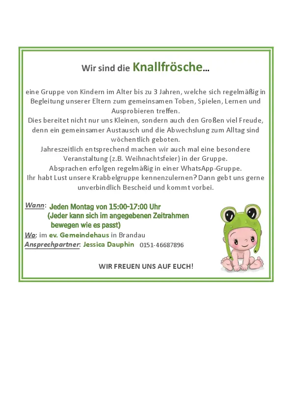 Krabbelgruppe | Kleinkinder bis 3 Jahre | donnerstags 15:00 Uhr | Gemeindehaus Spachbrücken | Lisa Richter lisarichterkv(at)web.de |